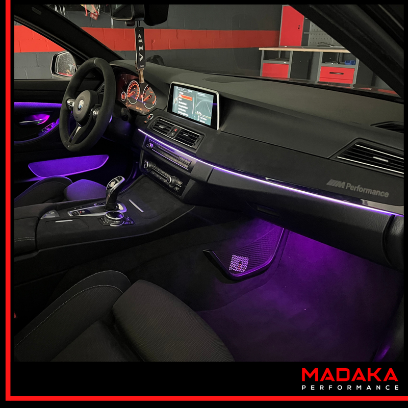 Du möchtest in Deinem BMW 5er F10 F11 F07 die 64 Farben 2-Zonen Ambientebeleuchtung nachrüsten? Madaka Performance macht's möglich!